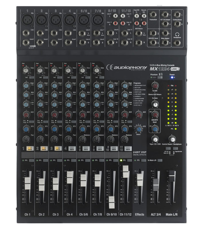 AUDIOPHONY MX1224 Tables de mixage Live - Mixer live 6 micros + 2 lignes + DSP 24 bits 10 FX Avec un port USB Vue d'ensemble