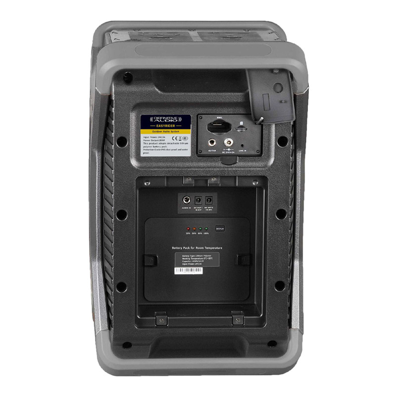 • Utiliser une Sono Portable sous intempéries ne sera plus jamais une contrainte avec l’arrivée de L’EASYRIDER. Spécialement conçue pour une utilisation en extérieur ou dans des lieux humides grâce à une fabrication aux normes IP65. Trop souvent impossible ou pas recommandé avec l’EASYRIDER il sera simple et facile de sonoriser une piscine, des évènements sportifs, religieux, culturels ou autres en extérieur sans avoir à se soucier des conditions climatiques. Avec une R&D très poussée, l’EASYRIDER apparait avec un design épuré et novateur et une qualité son remarquable.