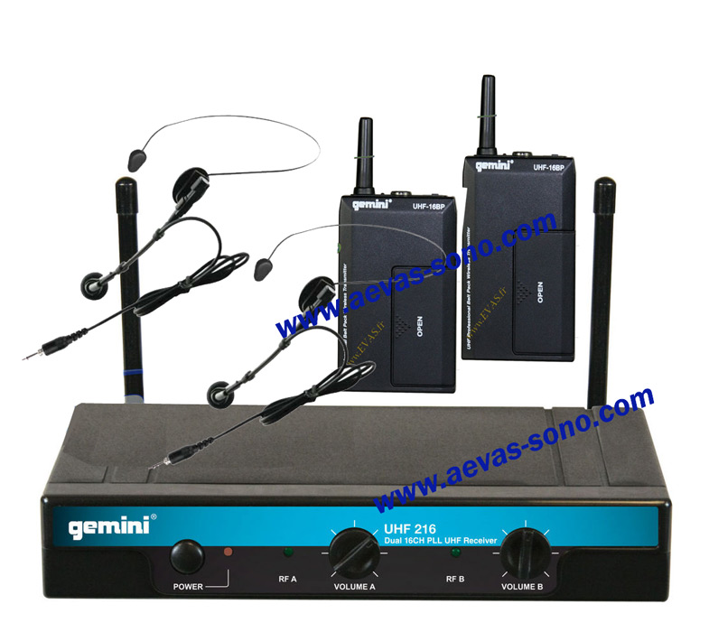 Gemini UHF-216 HL Double micro hf gemini, ensemble complet incluant récepteur double canal UHF-216 et 2 émetteurs ceinture UHF-16BP et 2 micros combo HSL-08 (Lavalier et ou cravate).